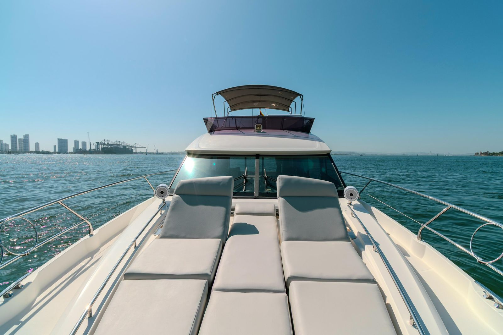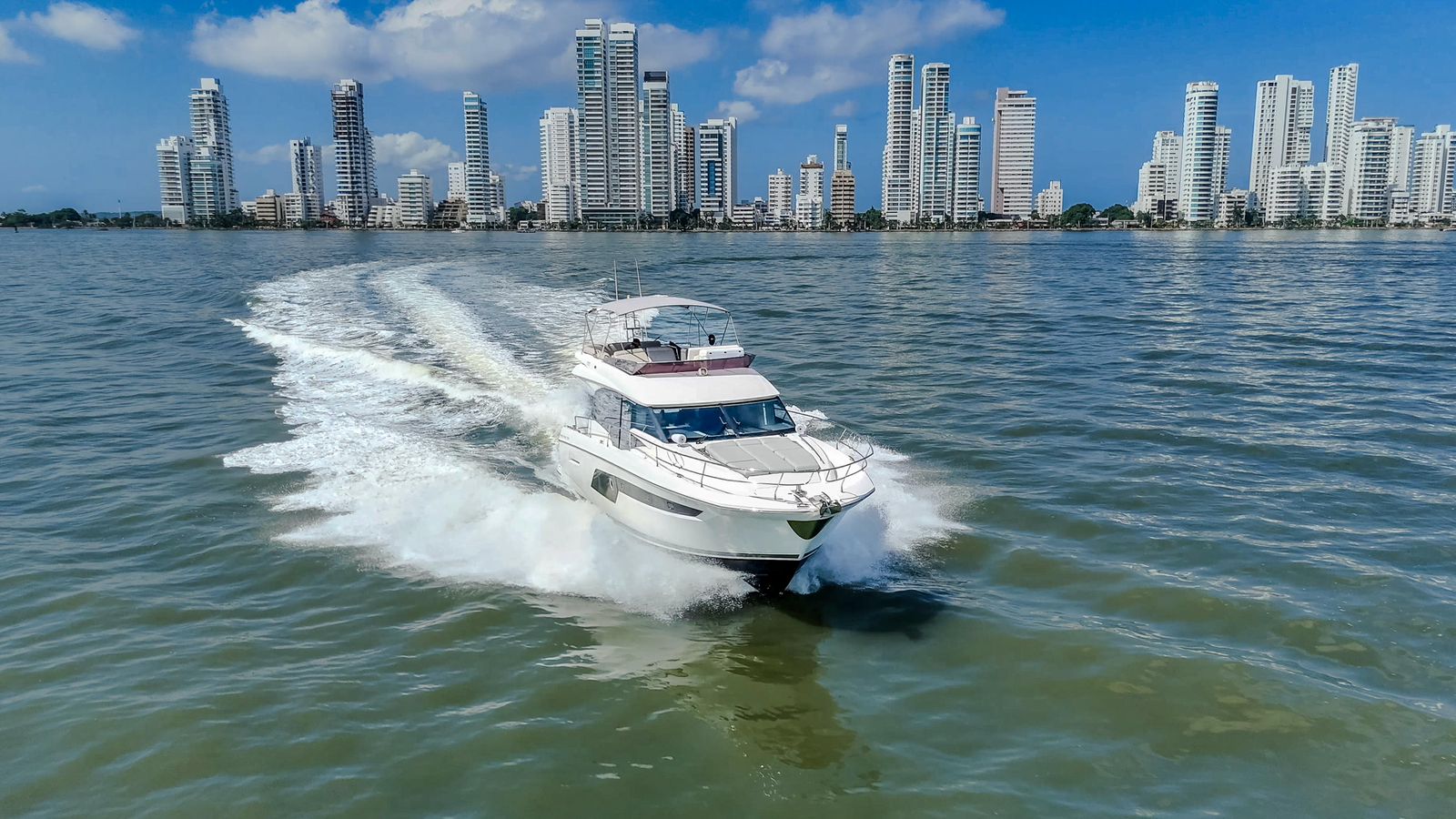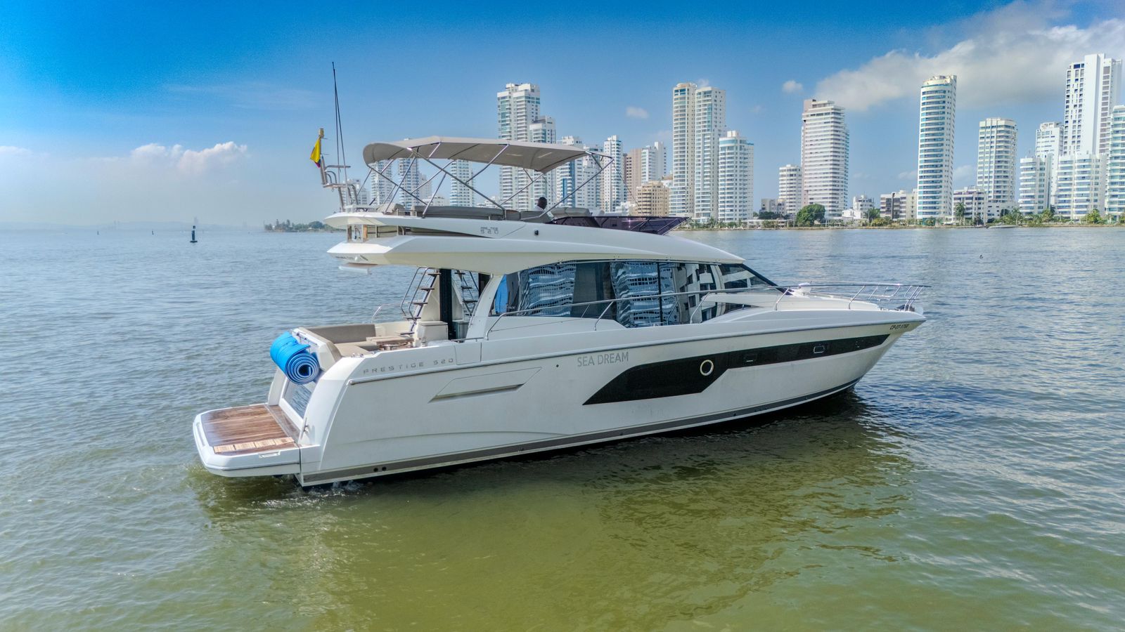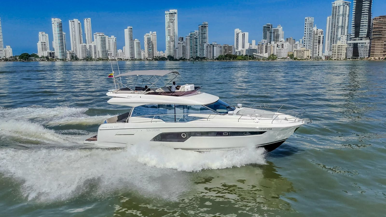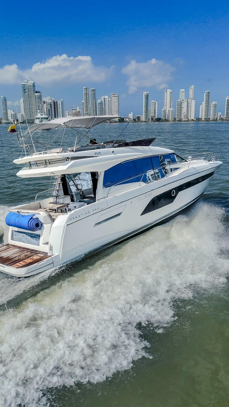 We set departure on a 520 Prestige F-Line Yacht Rental Cartagena for an unforgettable Island Tour. Step aboard, sip your welcome drink, and let our friendly crew create the perfect vibe. Then, as we cruise through the turquoise waters, get ready to explore Cartagena’s most beautiful islands— each with its own magic, hidden coves, and Caribbean charm.